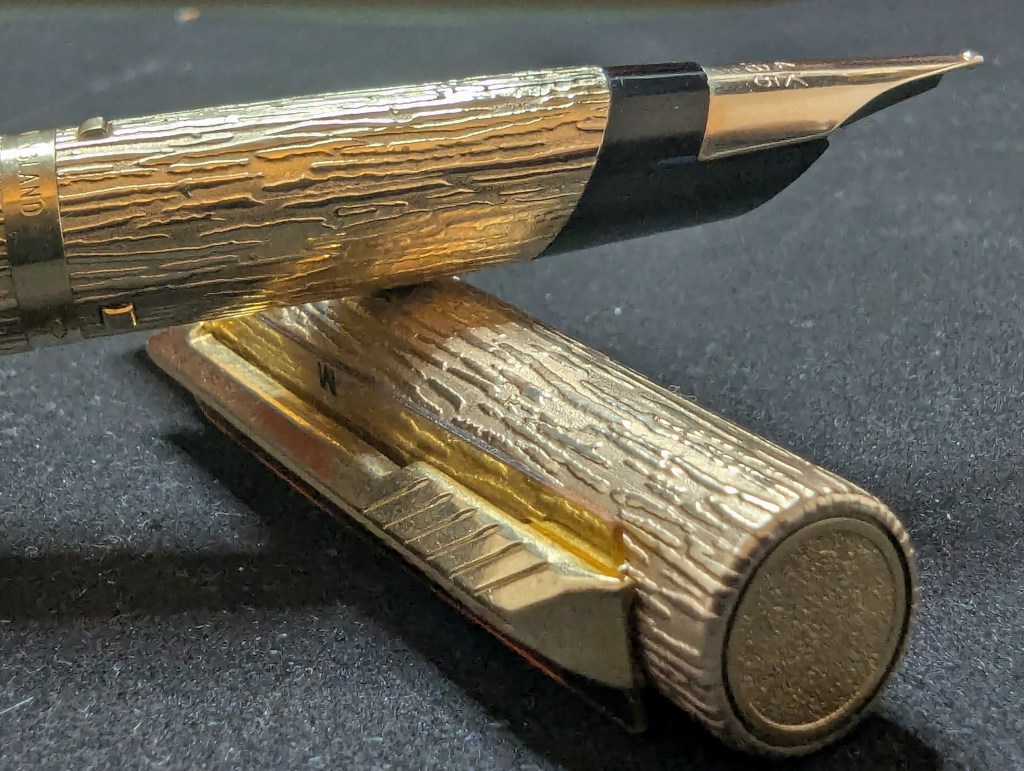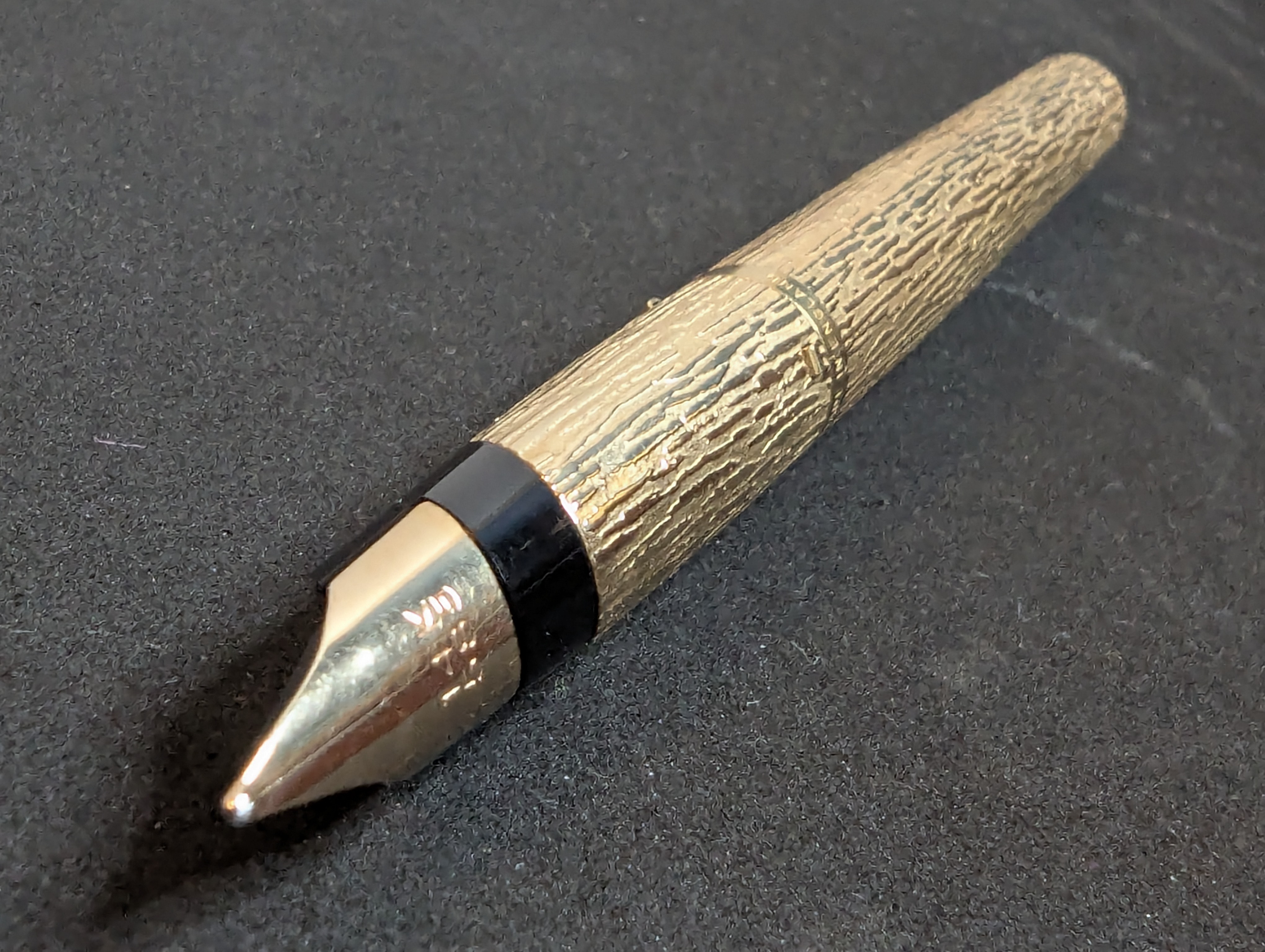 Its rarity however does not take anything away from it, for me this Pen is like a slightly more extravagant British version of the solid Lamy 2000, made from a metal body coated in rolled gold in a very fetching “Bark” pattern this pen does look like an opulent twig from the gardens of some fantasy pleasure palace. The 105 also comes in a flighter finish (don’t all Parker’s since the 70’s get that treatment?) and a rare silver version. The 105 was also used to commemorate the Royal wedding of Charles and Diana – so some real royal pedigree with this one.